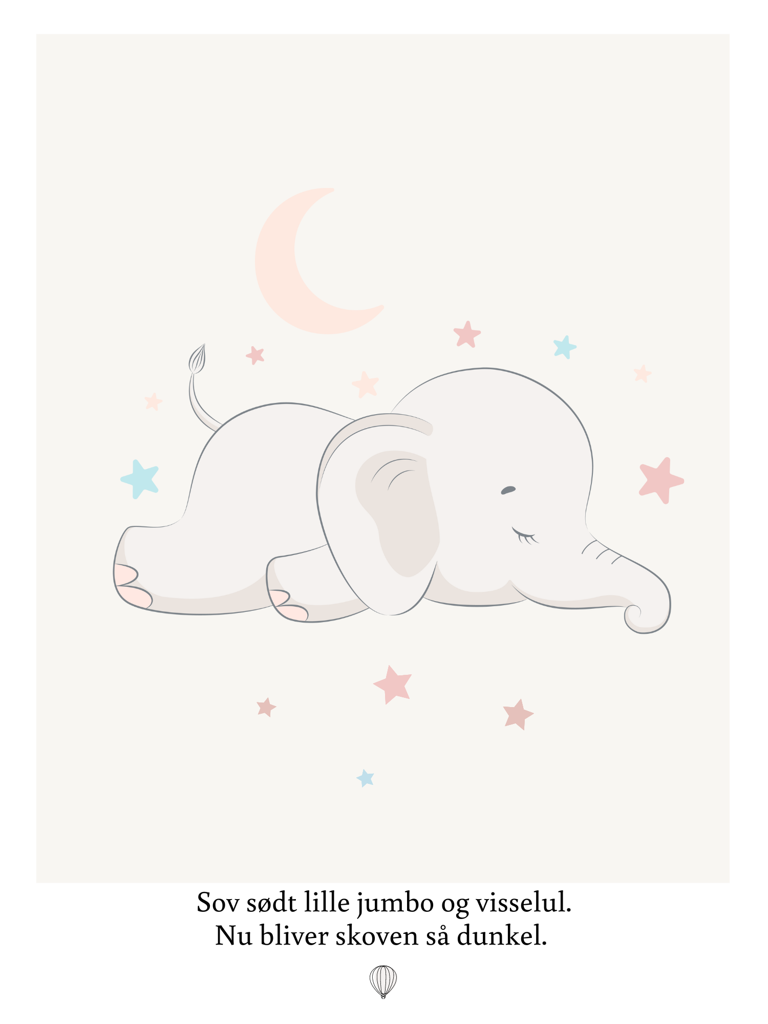 “Indfør en beroligende stemning på børneværelset med vores hjertevarme plakat, der hylder den skønne børnesang ‘Sov sødt lille Jumbo’!